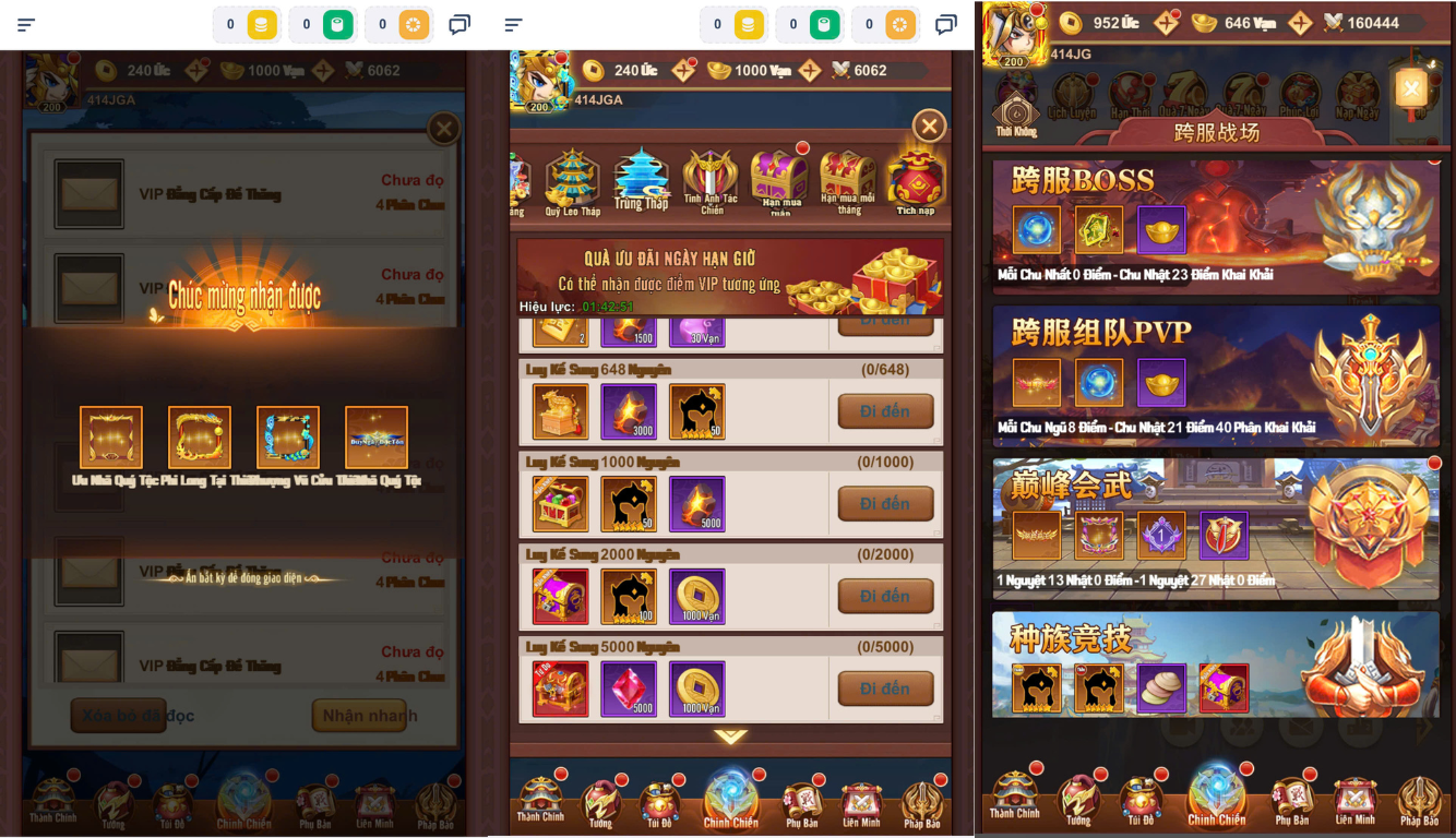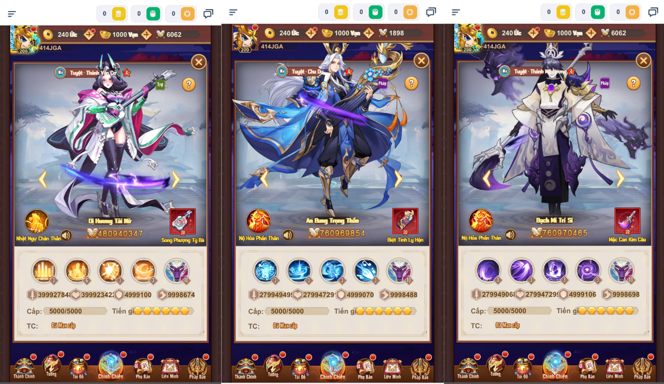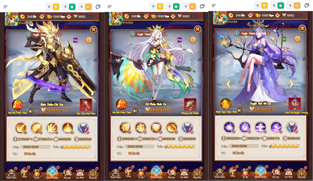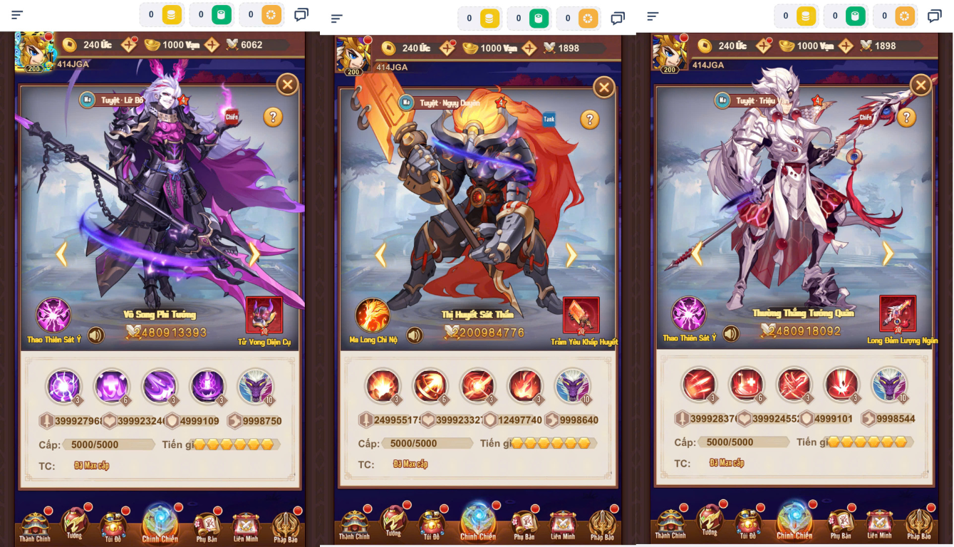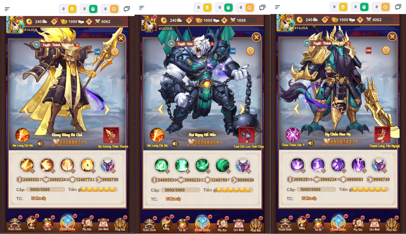 Bản Mới 200 sao,t200,lvl 50k,thú 1000,6 slot,vũ khí độc quyền của 47 tướng mới,update thêm 40 skin,update đột phá cảnh giới,kỹ năng 5…..