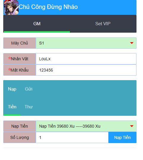 * Tool GM – Nạp Tiền – Gửi Thư – Cấp quyền sử dụng GM cho người chơi